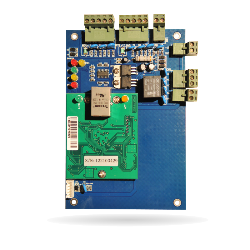Riadiaca jednotka pre obojsmernú kontrolu jedného prístupového bodu s pamäťou udalostí a komunikáciou cez TCP/IP rozhranie. 2x Vstup pre čítačku Wiegand 26, 1x Vstup pre odchodové tlačidlo, 1x Vstup pre monitorovanie dverí, 1x Výstupné relé NO/C/NC, Počet užívateľov: 20 000, Záznam udalostí: 100 000, (Dynamický buffer, údaje o prechodoch zostanú uchované aj pri výpadku napájania). Komunikácia: TCP/IP. Napájanie: 12 V DC. .