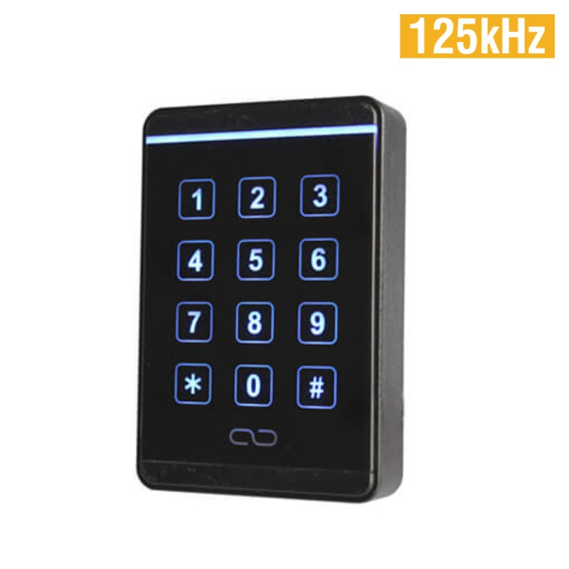 Kódovač so 125kHz čítačkou bezkontaktných kariet. Neobsahuje riadiacu jednotku. Čítacia vzdialenosť 3 - 10cm. Prevedenie: PVC (čierna živica pre funkciu vodotesnosti),IP65, podsvietená dotyková klávesnica, povrchová montáž, napájanie 9-12V DC/100mA. Rozmery: 112*75*21 (mm)