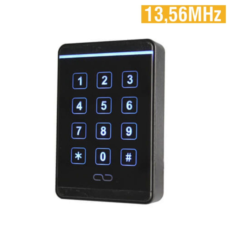 Kódovač s 13,56MHz MIFARE čítačkou bezkontaktných kariet. Neobsahuje riadiacu jednotku. Čítacia vzdialenosť 3 - 10cm. Prevedenie: PVC (čierna živica pre funkciu vodotesnosti),IP65, podsvietená dotyková klávesnica, povrchová montáž, napájanie 9-12V DC/100mA. Rozmery: 112*75*21 (mm)