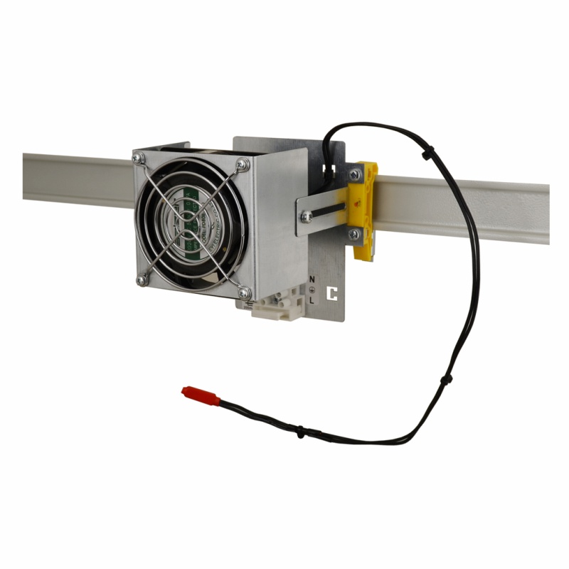 Ventilátor s termostatom na DIN lištu, aktivuje sa po prekročení teploty 45°C, Š=110, V=115, HL=85÷135 [mm, +/-2], uchytenie do skriniek a rackov, 230V AC