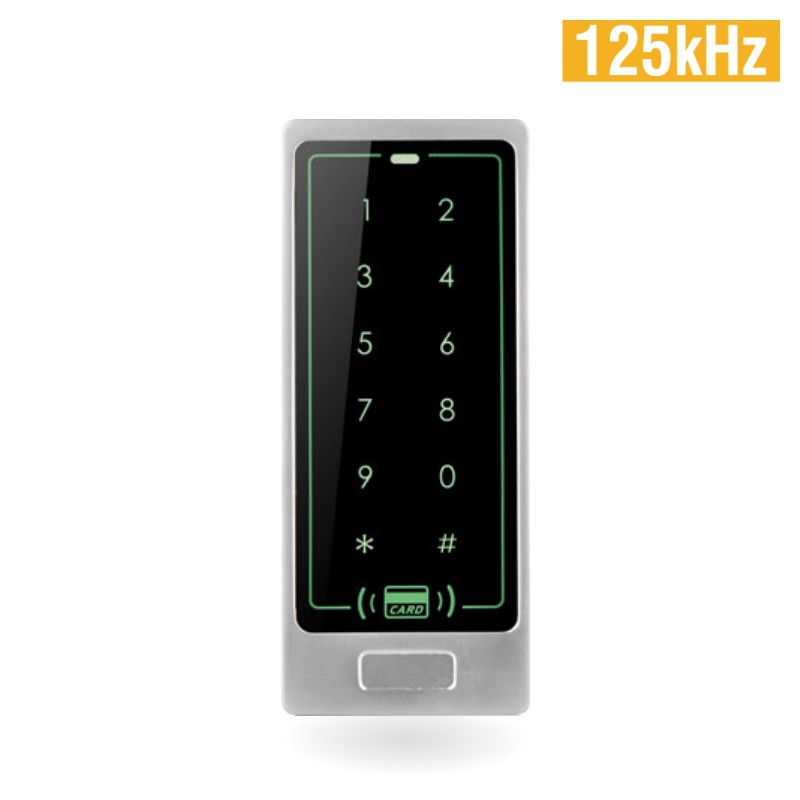 Kódovač so 125kHz čítačkou bezkontaktných kariet pre 1000 užívateľov. Prevedenie: hliníková zliatina,IP65, podsvietená dotyková klávesnica, povrchová montáž, napájanie 12V DC/100mA, nastavenie času otvorenia dverí: 0 - 99sek., Rozmery: 125(V)x 53(Š) x 23(H)mm.