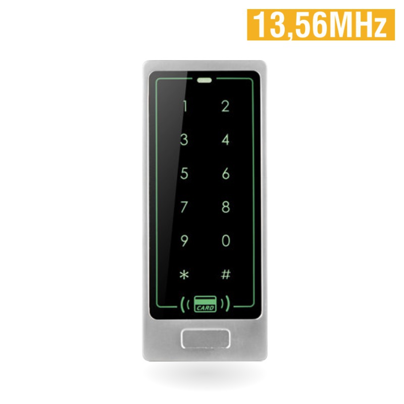 Kódovač s 13,56MHz MIFARE čítačkou bezkontaktných kariet pre 1000 užívateľov. Prevedenie: hliníková zliatina,IP65, podsvietená dotyková klávesnica, povrchová montáž, napájanie 12V DC/100mA, nastavenie času otvorenia dverí: 0 - 99sek., Rozmery: 125(V)x 53(Š) x 23(H)mm.