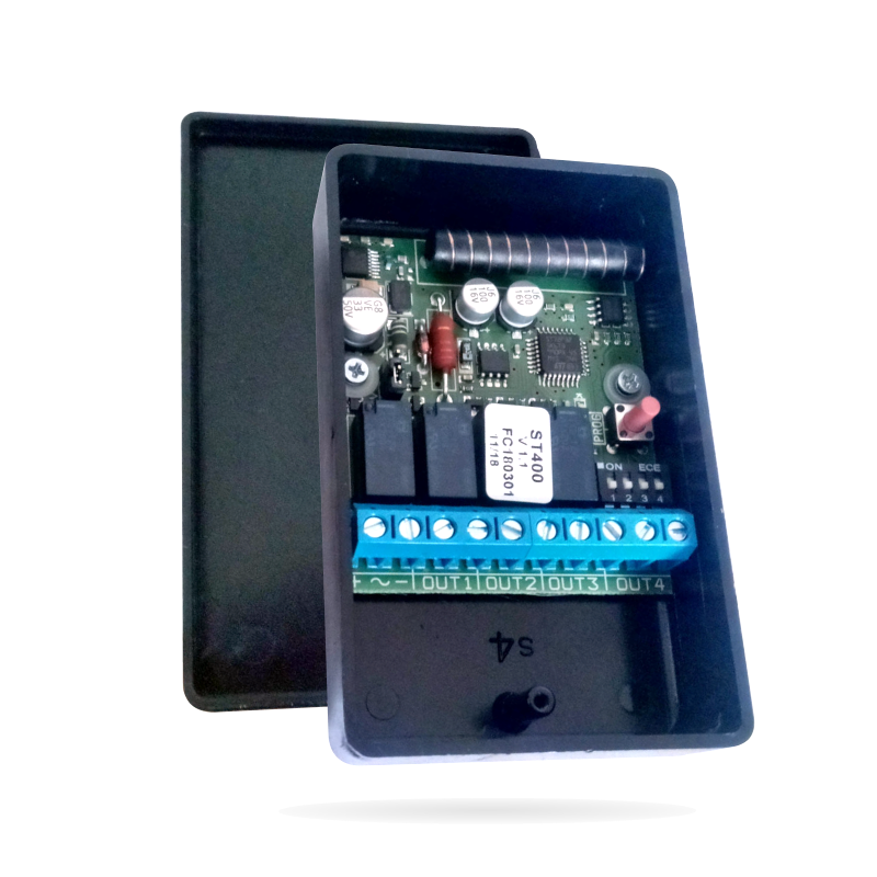 ST400 je prijímač bezdrôtovej nadstavby, obsahujúci 4 drôtové výstupy (relé), spolupracujíce s bezdrôtovými prvkami AMC série 400 (bezdrôtové pohybové detektory IF400, diaľkové ovládače TR400, kontakty CU400 ai.). Funkcie reléových výstupov je ľubovolne programovateľná. K prijímaču je možné prihlásiť max. 4 bezdrôtové prvky alebo až 100 diaľkových ovládačov. Bezdrôtový prenos je stabilný a zabezpečený (modulácia FSK - 112bit, plávajúci kód, k dispozícii sú 3 rôzne prenosové kanály pre zamedzenie presluchu medzi detektormi alebo výber najmenej zarušeného pásma. Napájanie prijímača je voliteľné medzi napätím 12Vdc/12Vac alebo 24Vac/24Vdc pomocou jumperu.
