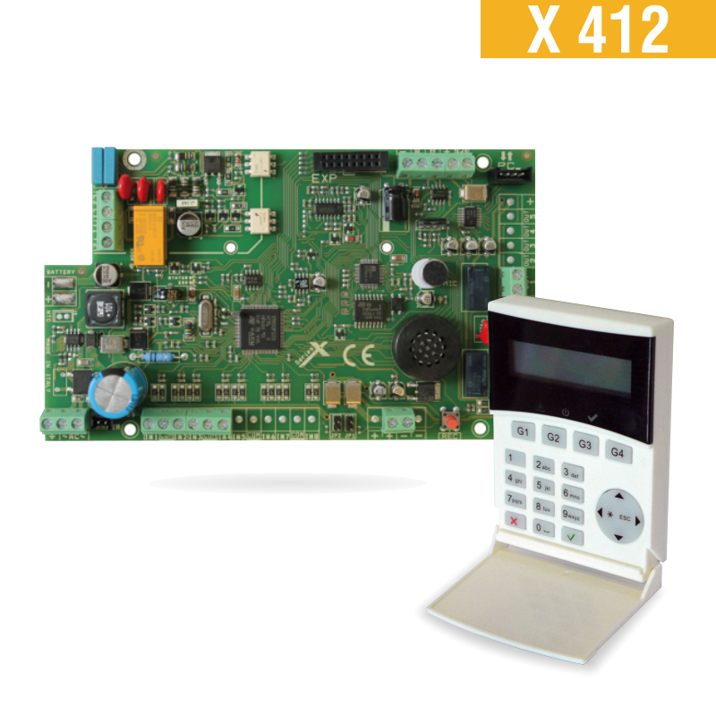 4/12 slučková ústredňa s LCD klávesnicou, plechovou skrinkou s tamper kontaktom a napájacím zdrojom. 4 samostatné podsystémy, 5/8 voľne programovateľné výstupy, poplachové relé, možnosť pripojenia 4 klávesníc, pamäť 1000 udalostí, 32 užívateľských kódov, osadený hlasový komunikátor na pevnú linku PSTN. Možnosť pripojenia systémového GSM/GPRS modulu ( X-GSM), rádiový modul pre 32 prvkov. Slovenský softvér, programovanie cez PC alebo klávesnicu, rozširiteľné o IP modul (IP1) pre ďiaľkovú správu cez SMARTFON (IPHONE, ANDROID)