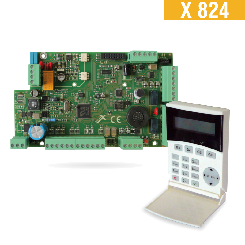 8/24 slučková ústredňa s LCD klávesnicou, plechovou skrinkou s tamper kontaktom a napájacím zdrojom. 4 samostatné podsystémy, 5/8 voľne programovateľné výstupy, poplachové relé, možnosť pripojenia 4 klávesníc, pamäť 1000 udalostí, 32 užívateľských kódov, osadený hlasový komunikátor na pevnú linku PSTN. Možnosť pripojenia systémového GSM/GPRS modulu ( X-GSM), bezdrôtová nadstavba. Programovanie cez PC alebo klávesnicu. Rozširiteľné o IP modul (IP1) pre ďiaľkovú správu cez smartfón (iPHONE + ANDROID)